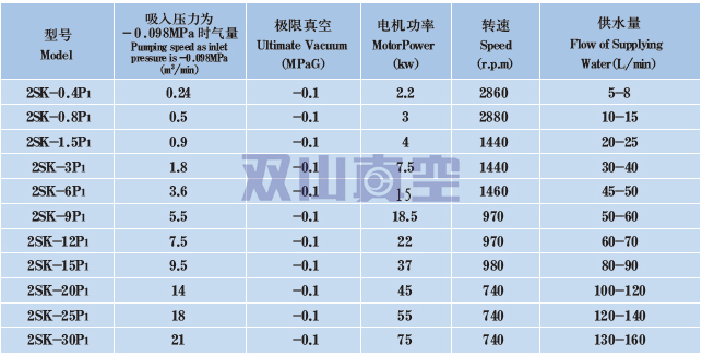 該類真空機(jī)組是由2SK系列兩級(jí)水環(huán)真空泵在吸入口加裝大氣泵組成,最低吸入壓力可達(dá)0.5~1kPa(A),在吸入壓力為1 ~ 6kPa(A) 之間仍有較大抽速,因此適合于在較高真空下工作。