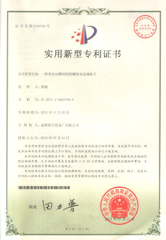 “一種帶有溝槽結(jié)構(gòu)的鑲鑄雙金屬轉(zhuǎn)子”獲實(shí)用新型專利證書